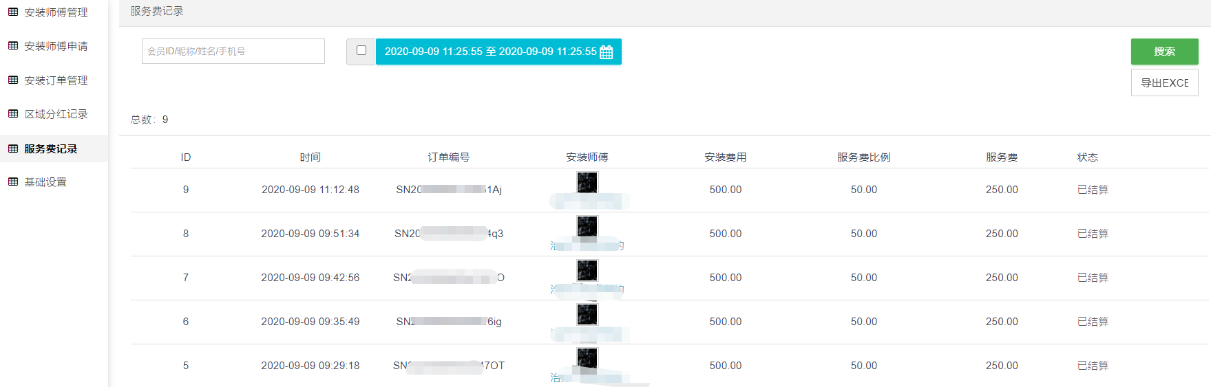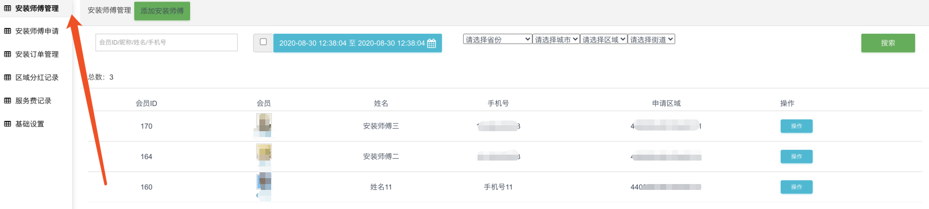 4. 申请被通过审核后台,会员中心入口变为安装服务和安装师傅