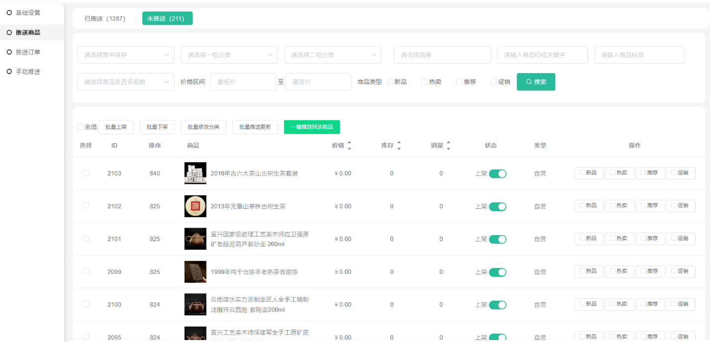 2、一键推送同步商品(把商城自营全部未推送的商品推送到第三方)