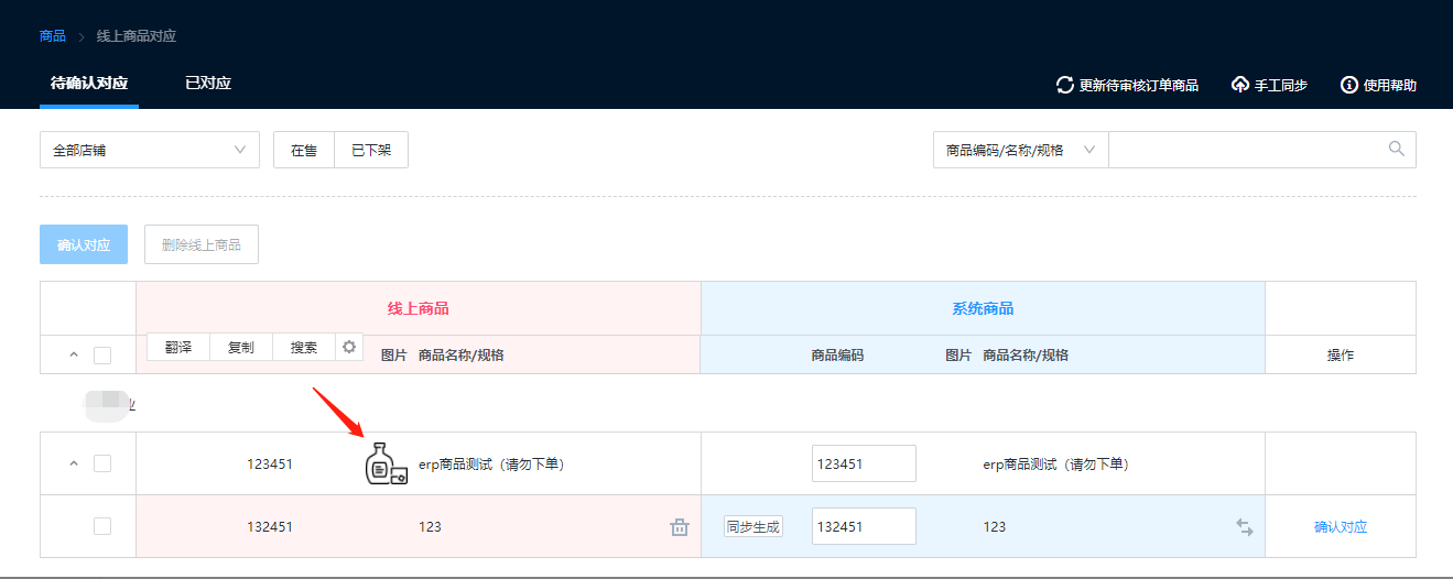 手动推送订单,提示:商品未同步无法推送