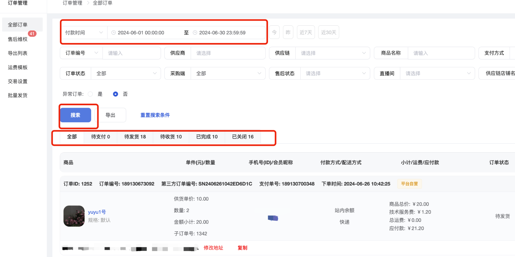 1、订单搜索筛选导出,通过多个条件快速搜索筛选订单;