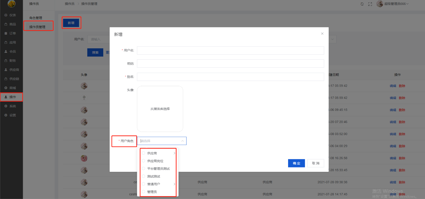 新增管理,设置用户名密码用户登录,选择角色设置权限