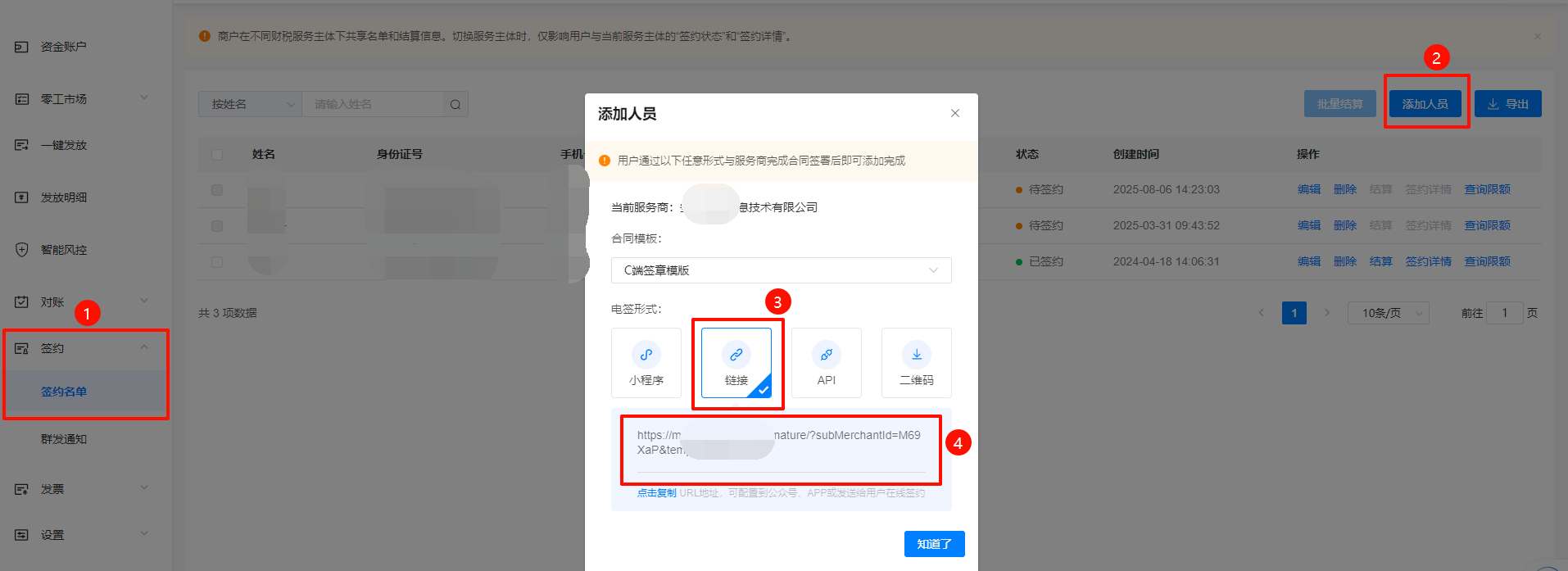 (2)获取签约地址:签约--添加人员--链接--点击复制