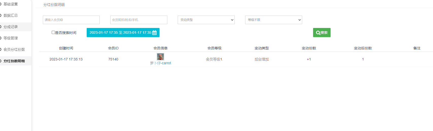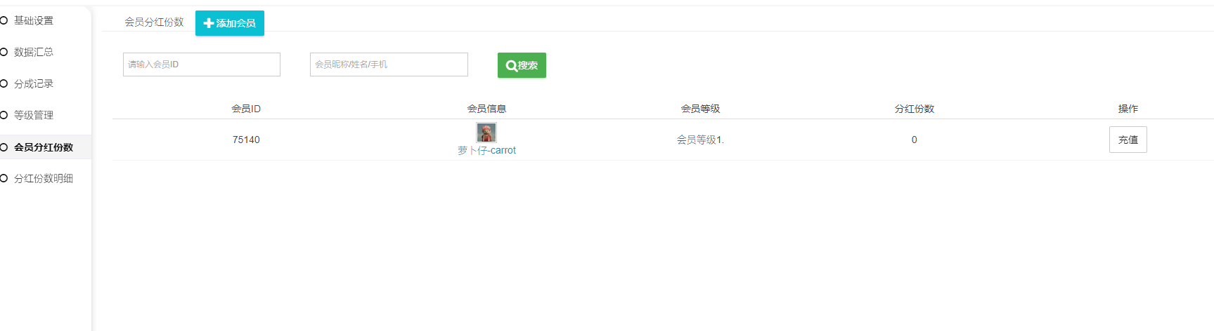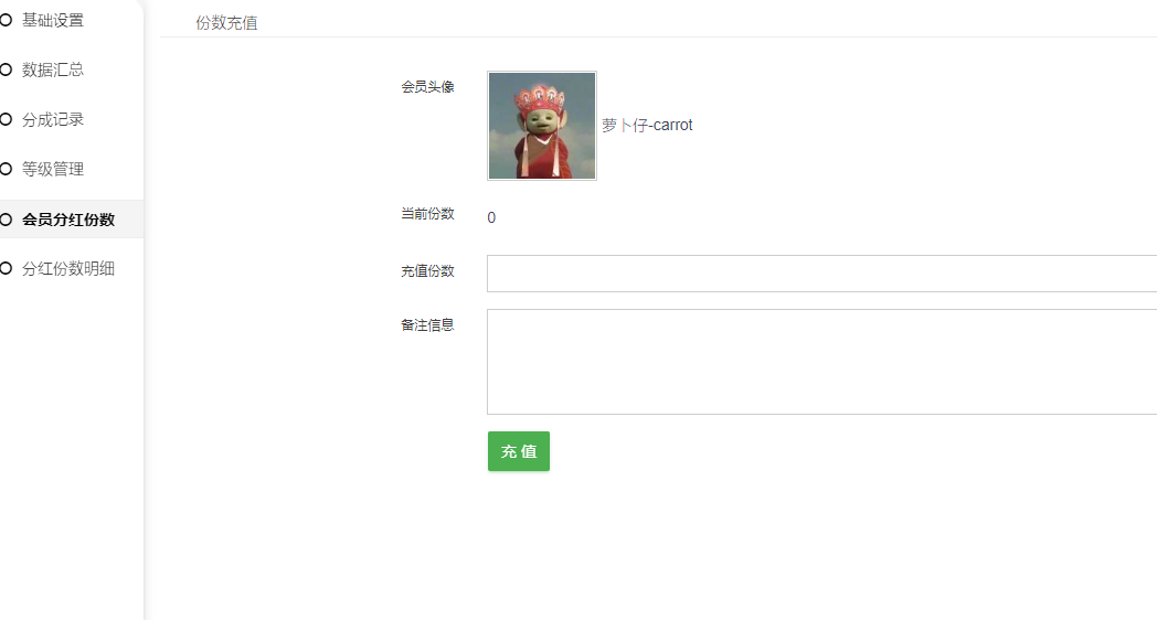 1、会员分红份数:会员的总分红份数,可点击充值,可充值负数