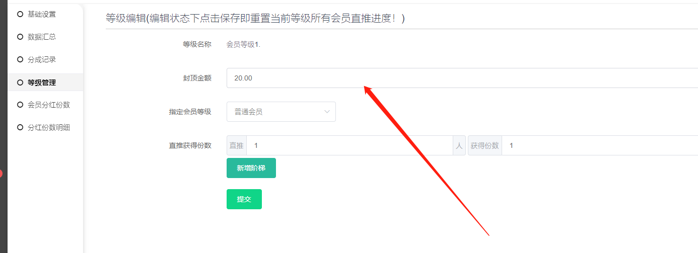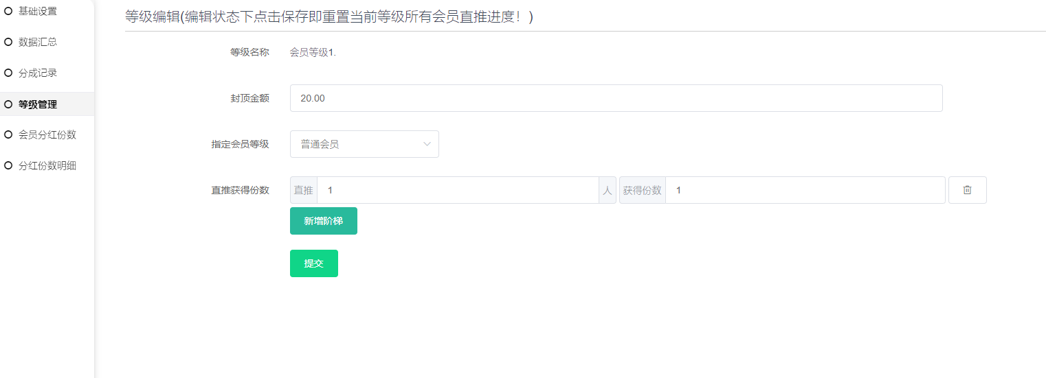 1、等级编辑增加新增直推N人获得M份设置,可设置多个阶梯;等级编辑保存后会重置当前等级所有会员的直推进度