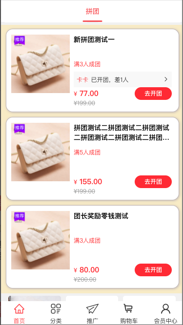1, 在拼团活动聚合页可查看到已开始、未结束的拼团活动,在此列表可查看到拼团活动名称、拼团最低金额,拼团最低金额所需人数,拼团中拼团(后台基础设置需要开启),点击去开团跳转到拼团活动详情页