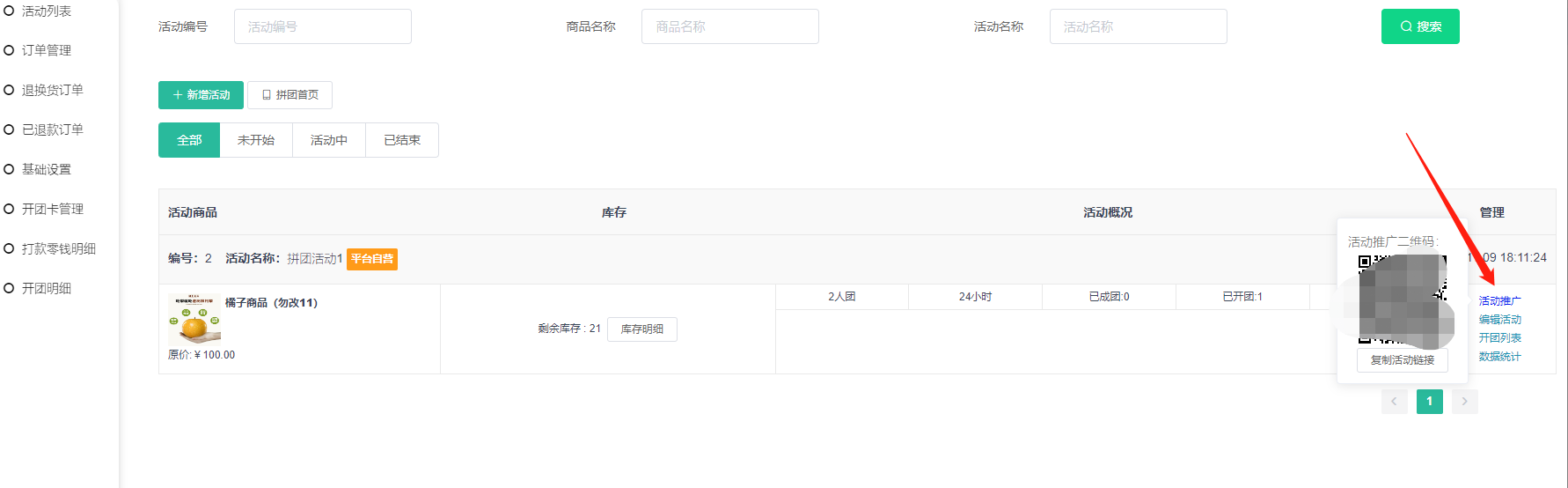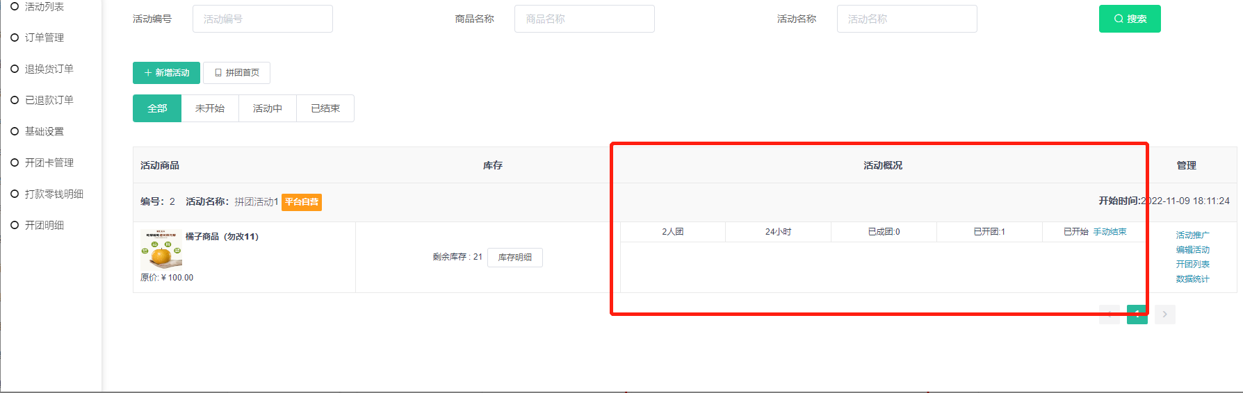 2, 活动概况:已开团数量和已成团数量,可手动结束拼团