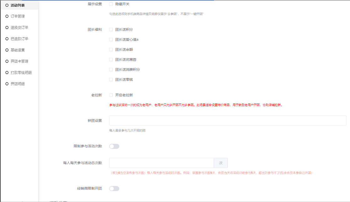 3, 聚合页面拼团中活动是否显示:开启后前端聚合页面,活动列表会显示正在拼团中的拼团