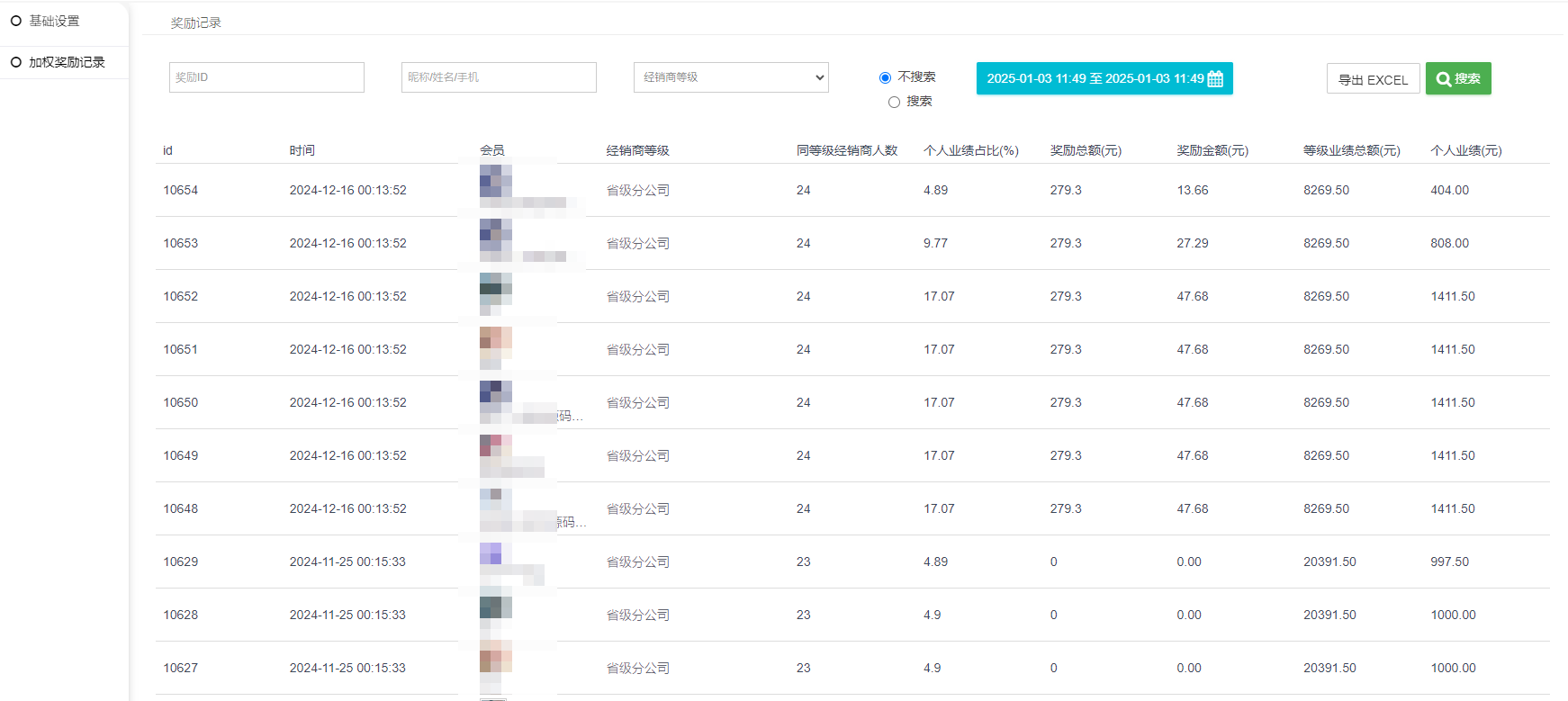 3) 个人月度分红比例:个人月度业绩/同等级经销商业绩总和