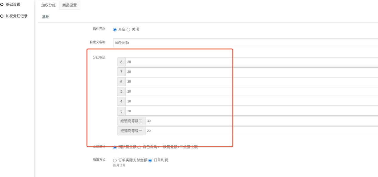 5) 计算基数:根据加权分红设置的不同等级的经销商比例,商品下单订单完后*等级比例提取给对应的经销商等级;比例可以商品单独设置