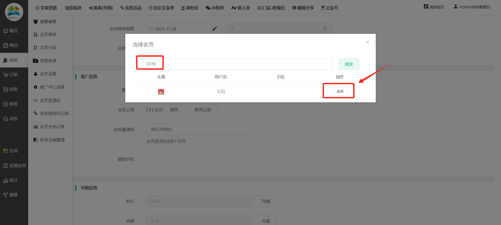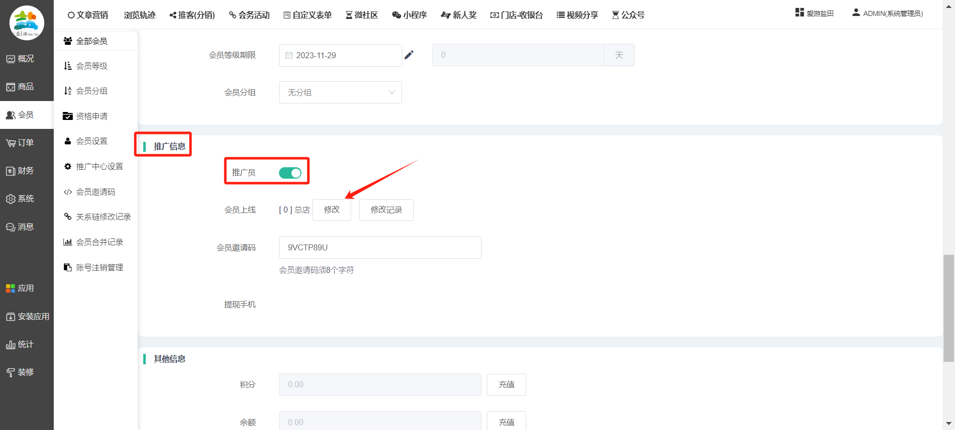目录 搜索 展开 一、前期准备资料二、数字乡村码-上线操作指南1、服务号的申请流程及认证2、申请小程序流程3、开放平台绑定小程序和公众号三、数字乡村码-系统操作数字乡村码系统管理-概况数字乡村码-商品管理1、发布商品2、商品列表3、商品表单4、商品分类5、品牌管理6、配送模板7、评论管理8、优惠券管理9、商品标签10、退货地址设置11、满额优惠12、批量操作13、配送方式14、基础设置15、商品隐藏四、数字乡村码-会员管理1、全部会员2、会员等级3、会员分组4、资格申请5、会员设置6、推广中心设置7、会员邀请码8、会员关系链修改关系链修改记录9、会员合并记录10、账号注销管理11、会员设置中心五、数字乡村码-订单管理1、订单管理列表2、订单处理流程3、订单状态4、订单修改价格5、订单退款退货6、多包裹发货7、批量发货订单操作步骤8、催发货订单9、物流查询六、数字乡村码-财务管理1、余额设置2、会员余额3、充值记录4、转让记录5、余额明细6、收入明细7、提现设置8、提现统计9、积分管理10、转账审核11、收益广告12、批量充值七、数字乡村码-系统管理1、商城入口2、商城设置①、商城设置②、订单设置③、物流查询④、短信⑤、联系方式⑥、分类⑦、优惠券⑧、分享⑨、幻灯片⑩、广告位⑫、地图设置3、交易设置4、微信模板消息自定义消息模板(新版)自定义消息模板(旧版)小程序消息模板公众号模板消息变更公告5、语言设置6、权限管理7、多媒体管理八、数字乡村码-消息管理九、数字乡村码-应用管理十、数字乡村码系统-数据统计十一、数字乡村码-页面装修DIY1、模板管理2、店铺页面3、顶部导航4、底部导航5、DIY模板市场6、首屏广告7、基础设置8、装修DIY尺寸建议十二、供应商功能插件操作指南1、供应商2、门店-收银台门店申请和使用步骤门店管理①、门店-收银台 营销设置②、门店-收银台 分润设置门店分类门店申请门店审核门店商品门店商品订单收银台订单数据统计核销员基础设置默认设置门店装修3、微社区4、会务活动十三、营销插件操作指南活动报名提货卡新人奖微店问卷调查积分视频分享1、视频分享基础设置2、视频分享发现管理3、视频分享分类管理4、视频分享评论管理5、视频分享分红记录6、视频分享短视频中心每日红包幸运大抽奖签到优惠券二维码任务奖励优惠劵文章音频文章付费文章限时购新海报拓客卡操作流程积分活动素材中心视频红包十四、入驻门店应用类1、门店预约2、附近商品3、门店定位设置4、门店控制5、门店满额包邮6、门店满额减7、导入商品8、门店搜索9、门店股东10、核销券11、多门店核销1、商城后台设置2、前端功能演示十五、常见问题1、后台登录密码修改流程2、会员-余额,积分,后台如何进行充值与扣除3、如何修改上下级关系4、一种万能的获取商城小程序路径的方法 暂无相关搜索结果! 阅读次数:2079 本文档使用 模王系统 发布 8、会员关系链修改 8、会员关系链修改一.如何修改上下级关系?1.会员-全部会员-可以通过搜索用户的独立ID,或者用户微信昵称,找到此会员,然后点击右边的(操作)2.再点击会员详情。3.滑到下面,有个推广信息-会员上线,点击修改4.输入上级的ID号,点击搜索,出来此上级会员后点击选择。5.滑到最下面,一定要点击提交按钮。文档更新时间: 2023-11-30 14:56 作者:链上旅行