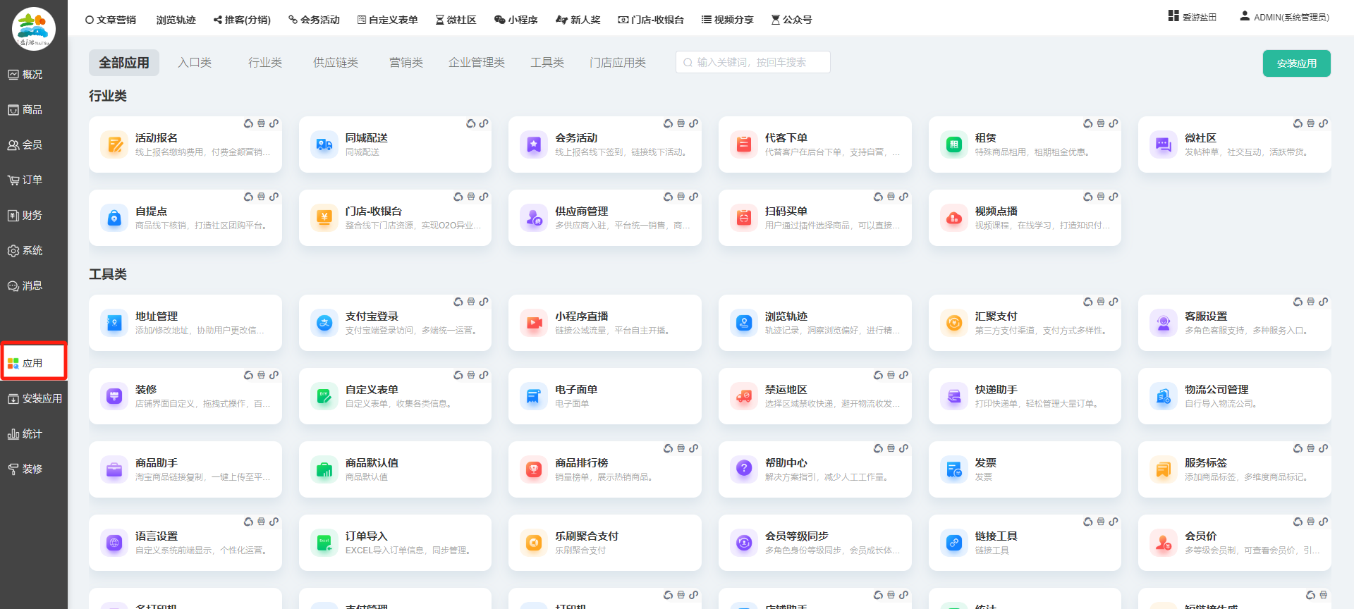 目录 搜索 展开 一、前期准备资料二、数字乡村码-上线操作指南1、服务号的申请流程及认证2、申请小程序流程3、开放平台绑定小程序和公众号三、数字乡村码-系统操作数字乡村码系统管理-概况数字乡村码-商品管理1、发布商品2、商品列表3、商品表单4、商品分类5、品牌管理6、配送模板7、评论管理8、优惠券管理9、商品标签10、退货地址设置11、满额优惠12、批量操作13、配送方式14、基础设置15、商品隐藏四、数字乡村码-会员管理1、全部会员2、会员等级3、会员分组4、资格申请5、会员设置6、推广中心设置7、会员邀请码8、会员关系链修改关系链修改记录9、会员合并记录10、账号注销管理11、会员设置中心五、数字乡村码-订单管理1、订单管理列表2、订单处理流程3、订单状态4、订单修改价格5、订单退款退货6、多包裹发货7、批量发货订单操作步骤8、催发货订单9、物流查询六、数字乡村码-财务管理1、余额设置2、会员余额3、充值记录4、转让记录5、余额明细6、收入明细7、提现设置8、提现统计9、积分管理10、转账审核11、收益广告12、批量充值七、数字乡村码-系统管理1、商城入口2、商城设置①、商城设置②、订单设置③、物流查询④、短信⑤、联系方式⑥、分类⑦、优惠券⑧、分享⑨、幻灯片⑩、广告位⑫、地图设置3、交易设置4、微信模板消息自定义消息模板(新版)自定义消息模板(旧版)小程序消息模板公众号模板消息变更公告5、语言设置6、权限管理7、多媒体管理八、数字乡村码-消息管理九、数字乡村码-应用管理十、数字乡村码系统-数据统计十一、数字乡村码-页面装修DIY1、模板管理2、店铺页面3、顶部导航4、底部导航5、DIY模板市场6、首屏广告7、基础设置8、装修DIY尺寸建议十二、供应商功能插件操作指南1、供应商2、门店-收银台门店申请和使用步骤门店管理①、门店-收银台 营销设置②、门店-收银台 分润设置门店分类门店申请门店审核门店商品门店商品订单收银台订单数据统计核销员基础设置默认设置门店装修3、微社区4、会务活动十三、营销插件操作指南活动报名提货卡新人奖微店问卷调查积分视频分享1、视频分享基础设置2、视频分享发现管理3、视频分享分类管理4、视频分享评论管理5、视频分享分红记录6、视频分享短视频中心每日红包幸运大抽奖签到优惠券二维码任务奖励优惠劵文章音频文章付费文章限时购新海报拓客卡操作流程积分活动素材中心视频红包十四、入驻门店应用类1、门店预约2、附近商品3、门店定位设置4、门店控制5、门店满额包邮6、门店满额减7、导入商品8、门店搜索9、门店股东10、核销券11、多门店核销1、商城后台设置2、前端功能演示十五、常见问题1、后台登录密码修改流程2、会员-余额,积分,后台如何进行充值与扣除3、如何修改上下级关系4、一种万能的获取商城小程序路径的方法 暂无相关搜索结果! 阅读次数:2105 本文档使用 模王系统 发布 九、数字乡村码-应用管理 九、商城管理-应用显示所有商城已安装并启用的应用,包含以下大类:具体根据自家商城后台系统显示为准。每个应用功能设置步骤较多,请查看相对应应用的学习文档。文档更新时间: 2024-01-08 10:36 作者:链上旅行