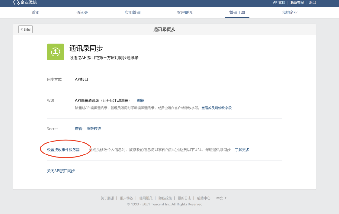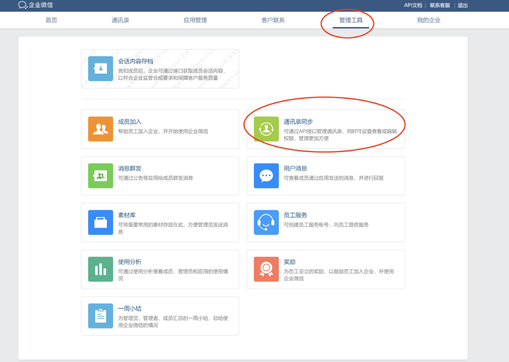 企业微信官方后台 -- 管理工具 -- 通讯录同步
