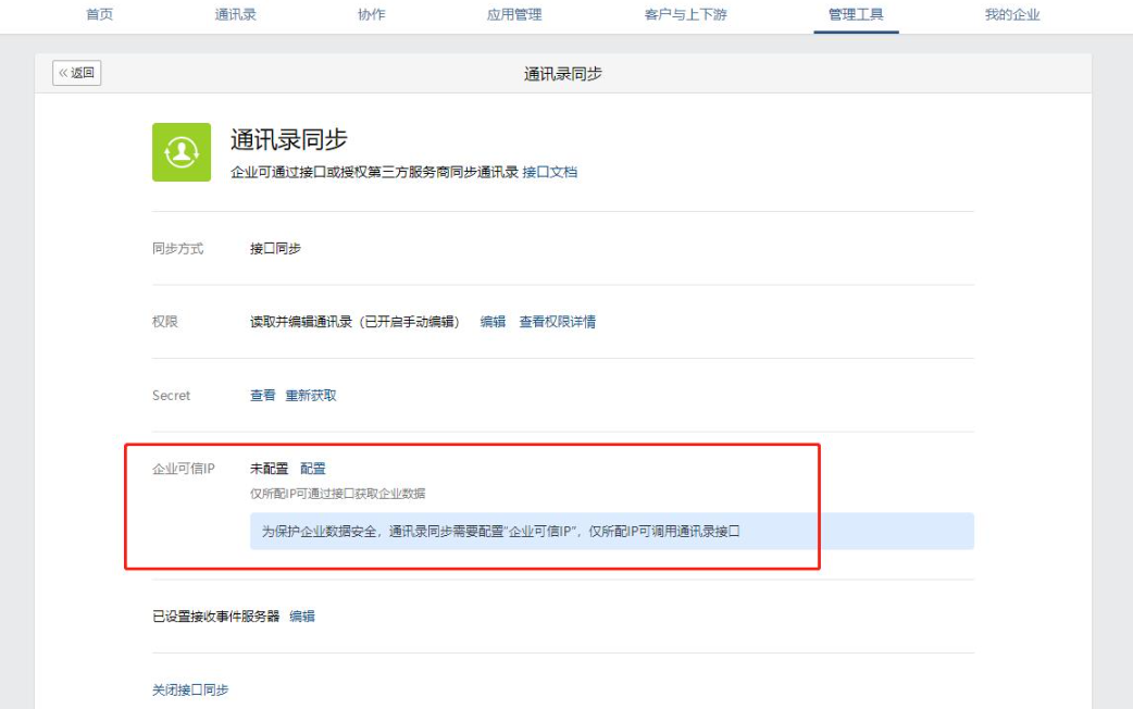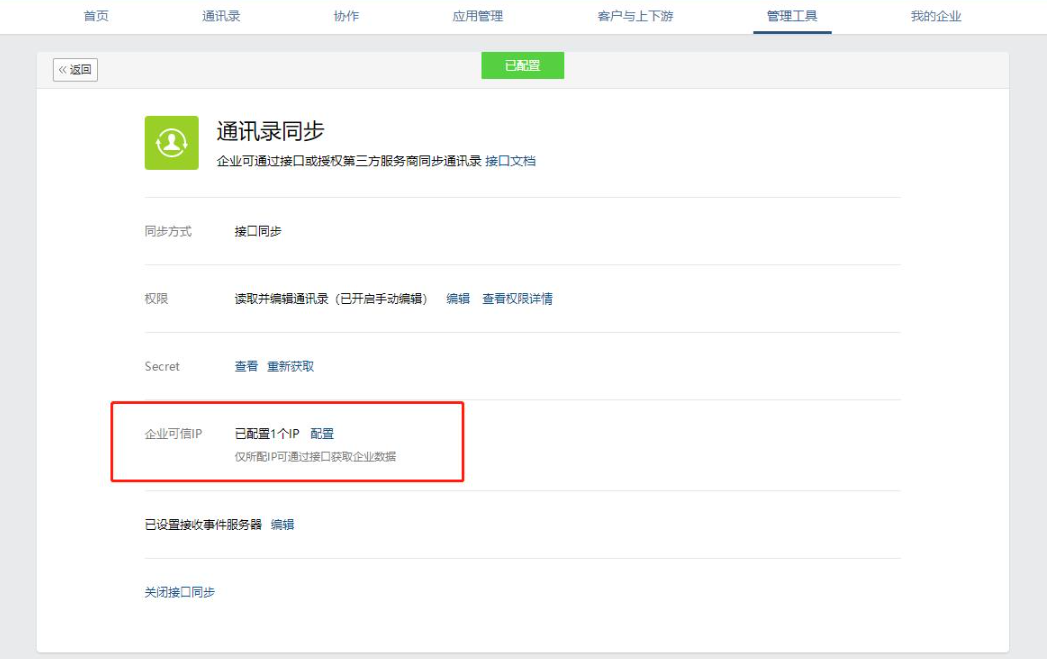 (注意:如果没有配置企业可信IP的入口,可点击关闭接口同步,再开启就有了)