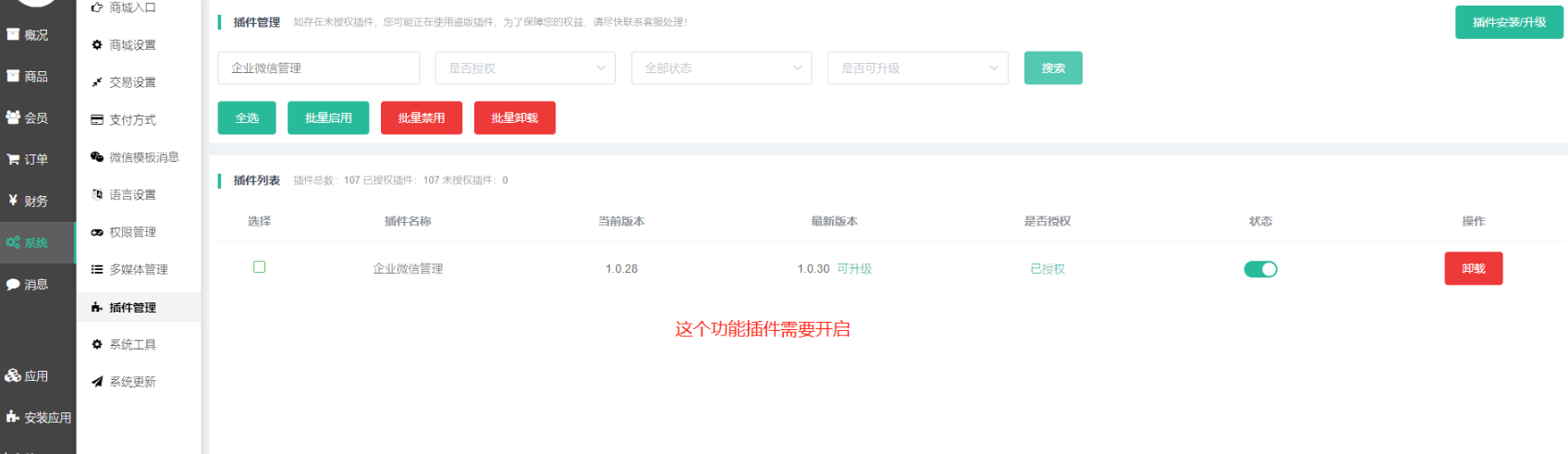 如果按以上保存流程,还是提示openapi回调地址请求不通过(如下图所示),请检查商城后台是不是还没启用“企业微信管理”这个功能插件(开启路径:商城后台--系统--插件管理--搜索“企业微信管理”,若是禁用状态,开启后,再在企业微信后台点击保存看看。)