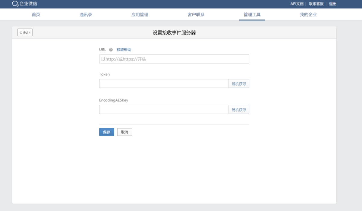 注意:在企业管理PC端--设置--企业微信设置中填写完corpid、通讯录管理sercet、通讯录变更通知token、通讯录变更通知aseKey点击保存后,才能保存企业微信官方后台通讯录设置中的接收事件服务器设置: