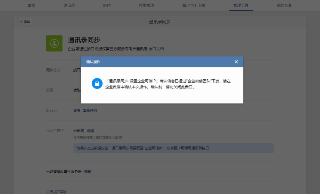 点击设置接收事件服务器,会弹出窗口提示在企业微信客户端进行二次确认;