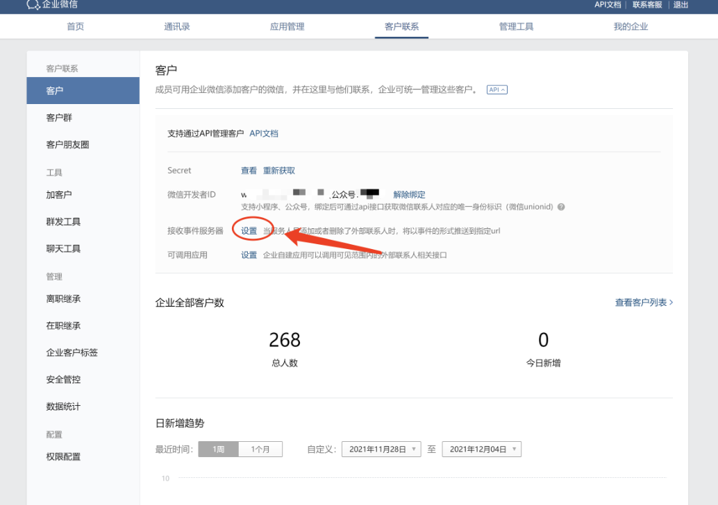 企业微信官方后台--客户联系--客户--API--secret中查看获取secret信息并填入企业管理PC端--设置--企业微信,客户管理secret中;