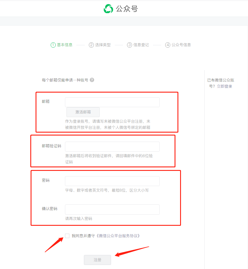 1.输入网址:https://mp.weixin.qq.com/,点击立即注册:
