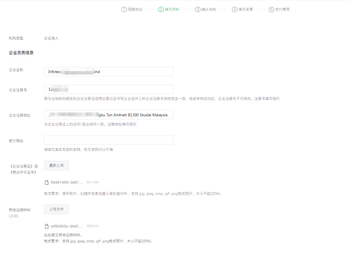 6.填写企业信息:类型是公司还是个体;公司名称、公司注册号、公司注册地址
