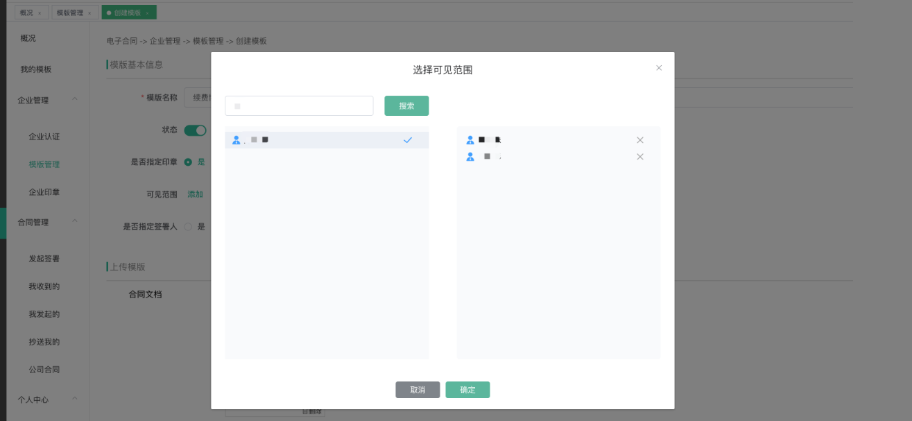 - 可见范围:选择部门或者指定员工可以查看使用该合同模板;