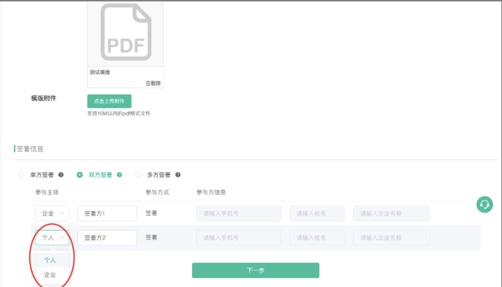 - 签署信息:选择签署方(几方签署)、签署主体(企业或个人),如选择了双方签署,使用该模版发起时对应的就是2方盖章。