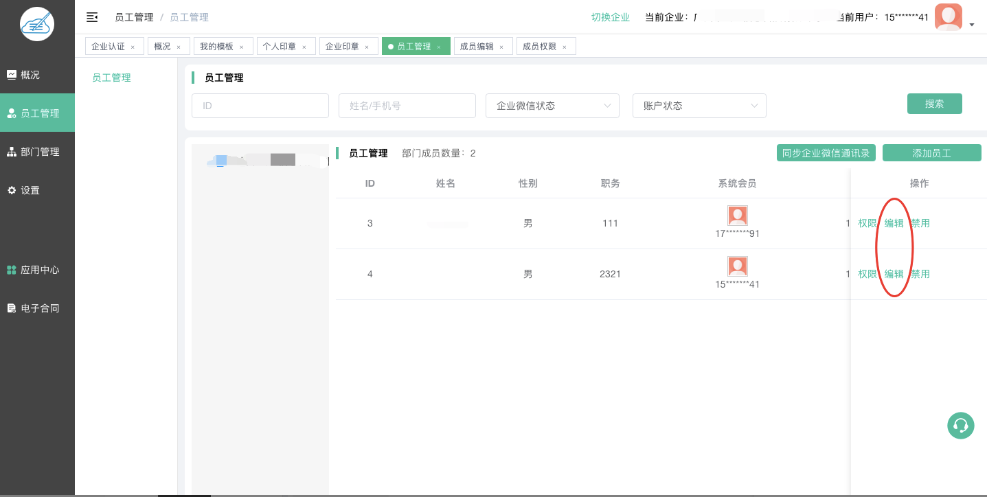 禁用:将员工禁用后,员工则没有该企业签发合同的权限。