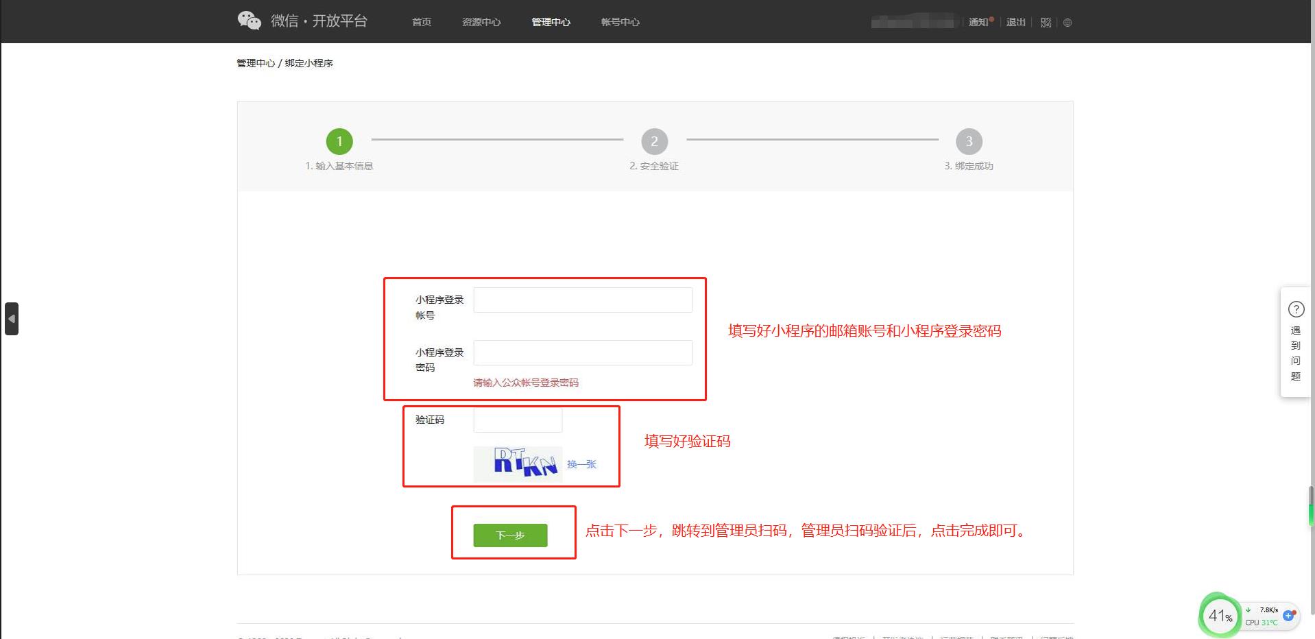 第九步:认证通过之后,点击管理中心,分别选择公众号和小程序,来绑定账号。