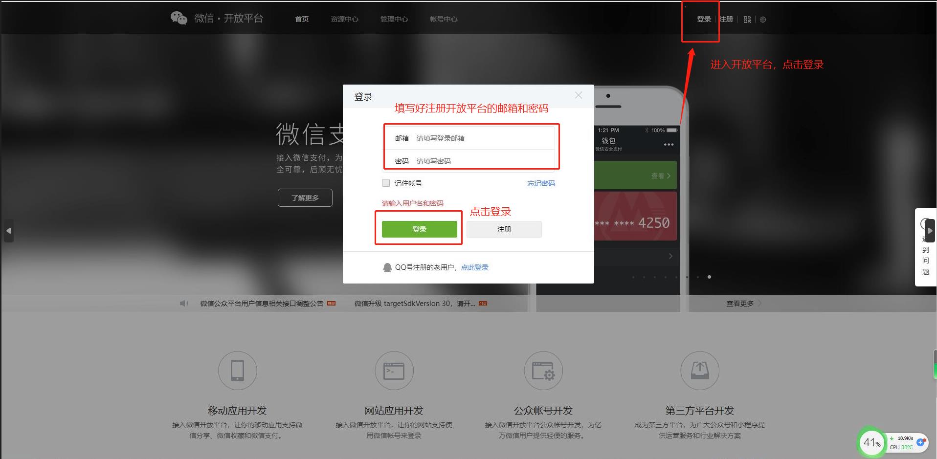 第七步:认证完成后,登录开放平台。