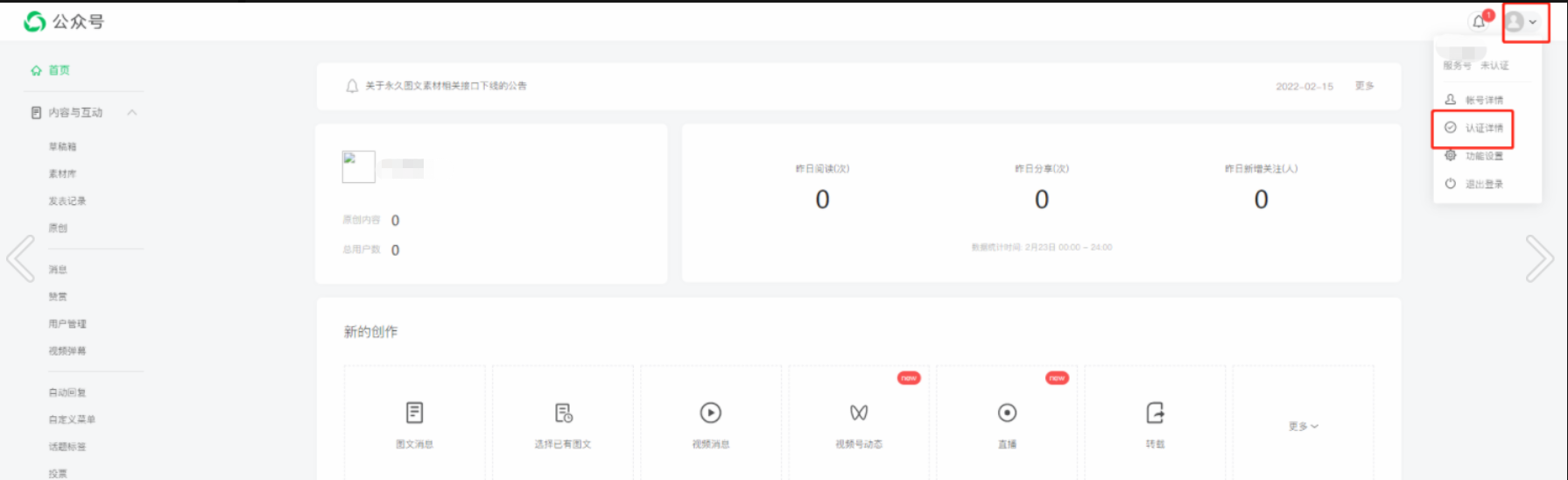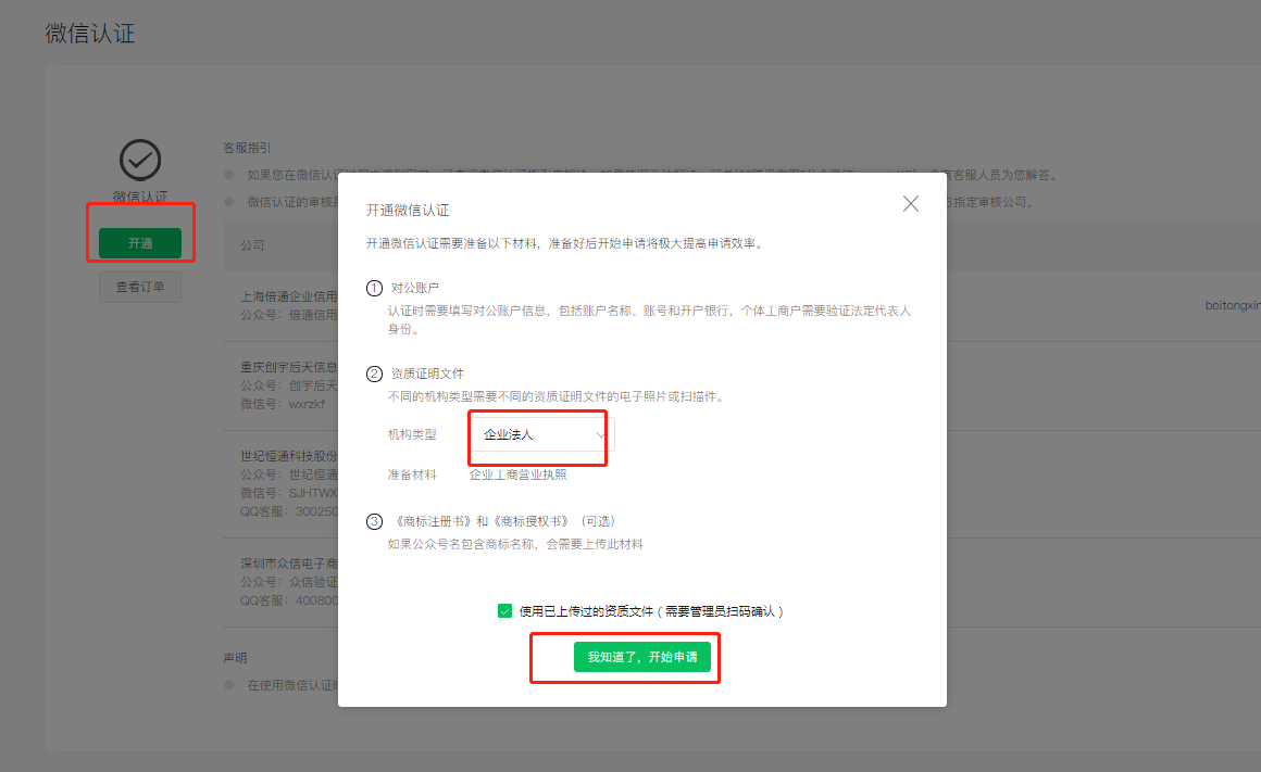 三:服务号认证:扫码登录-点击右上角图标-认证详情-开通-开始申请-(管理员扫码)-开始认证