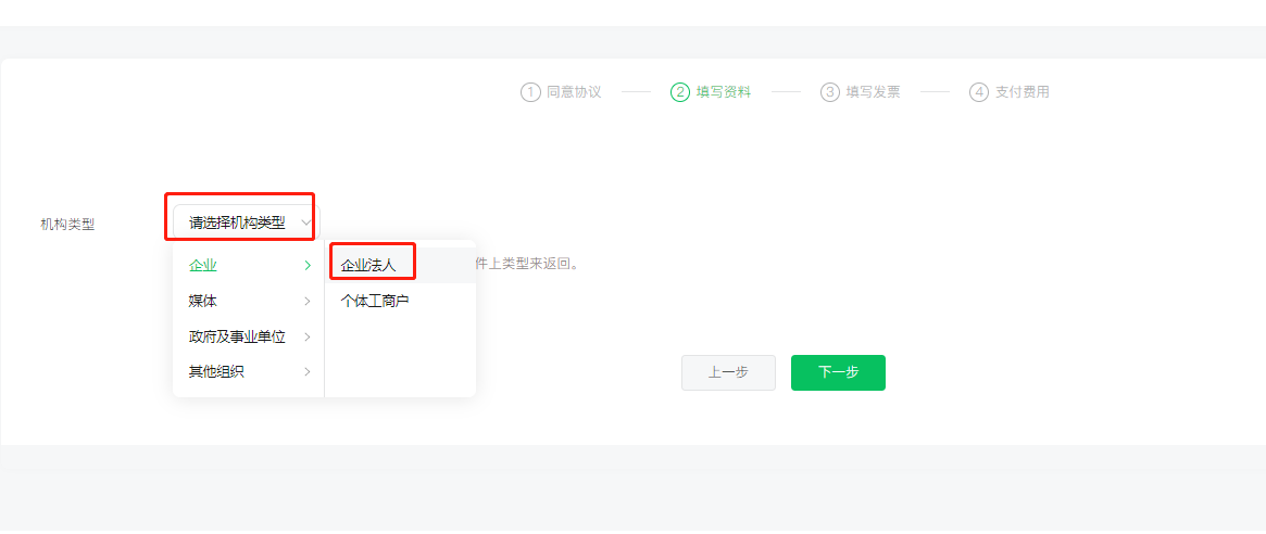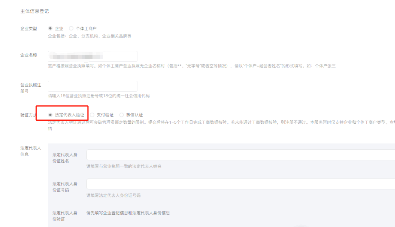 4、根据提示填写信息,注意:验证方式选择法定代表人验证(认证速度快),需要法人微信扫码-填写管理员信息(法人最佳)-