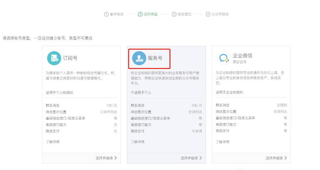 1、进入官网后,点击“立即注册”,进入类型选择页面,选择“服务号”