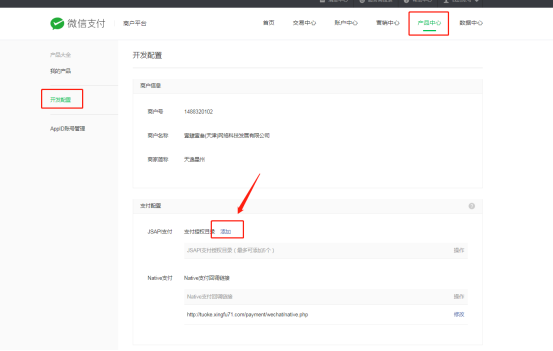 商户号后台开发配置处添加 JSAPI支付 支付授权目录