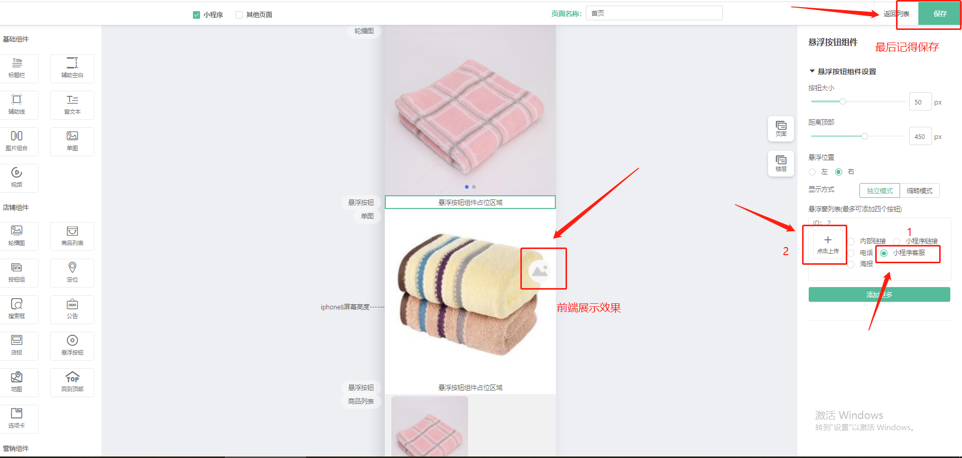 2.进入系统后台,装修DIY首页添加悬浮按钮,并添加客服,最后记得保存