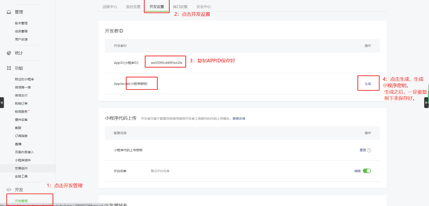 获取appid和Appsecret的路径:登录小程序平台mp.weixin.qq.com ==> 开发管理 ==> 开发设置 ==> 获取小程序appid;小程序Appsecret需要生成时(需要管理员微信扫一扫扫码,不能长按识别)才能获取到,仅生成时可以查看获取,确定后不再支持查看,除非重置过。