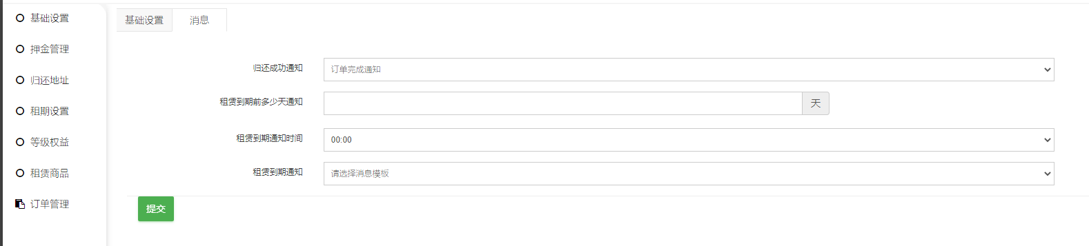 开启/关闭租赁:开启后商品才会具备租赁设置,前端购物车增加租赁购物车功能。