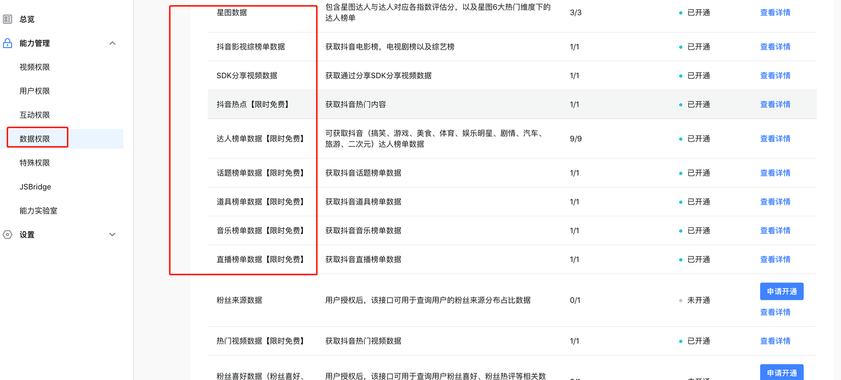 (需要用什么就对应开通即可,没有使用到的可以不用开通,比如视频分享页面需分享到抖音的,那么视频权限就需要开通)