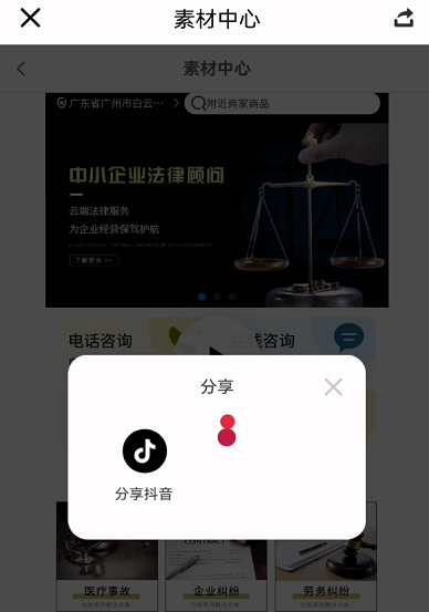 支持将商城的商品、短视频、素材中心三个板块的图片、视频素材一键分享到抖音;