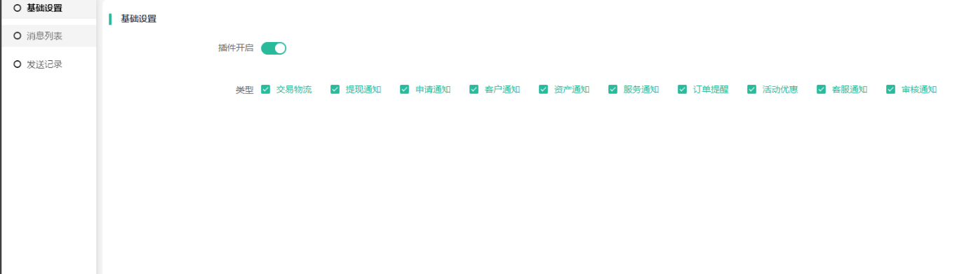 后台插件支持启用站内消息功能并设置指定消息发送通知,未勾选的则不发送通知。如下图