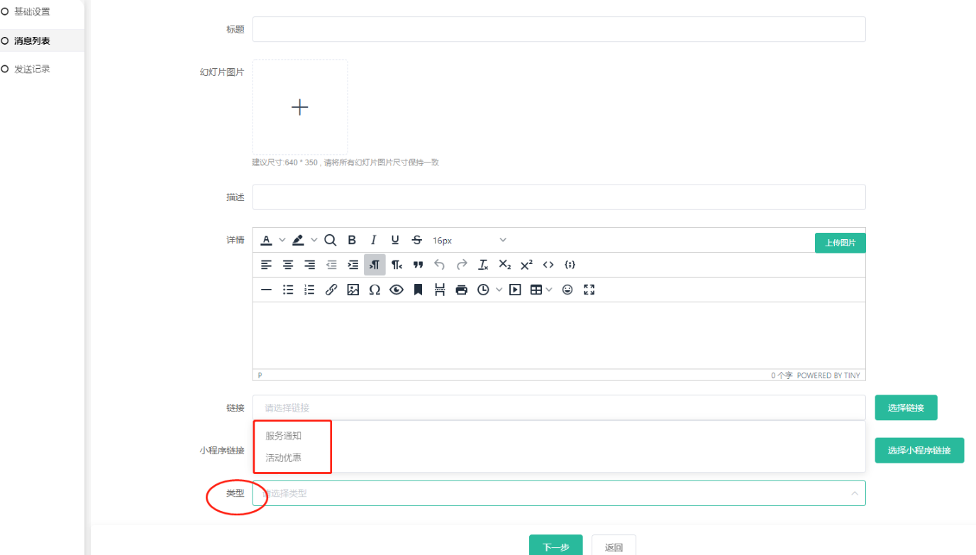 同时可选择消息点击跳转的链接,如果不设置链接,则默认为打开消息详情,设置链接则跳转到指定的链接。