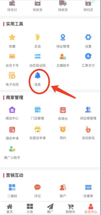 用户在前端会员中心--消息栏目中可以查看交易物流、提现通知、申请通知、客户通知、资产通知、服务通知、订单提醒、客服通知、后台推送的活动优惠等信息。