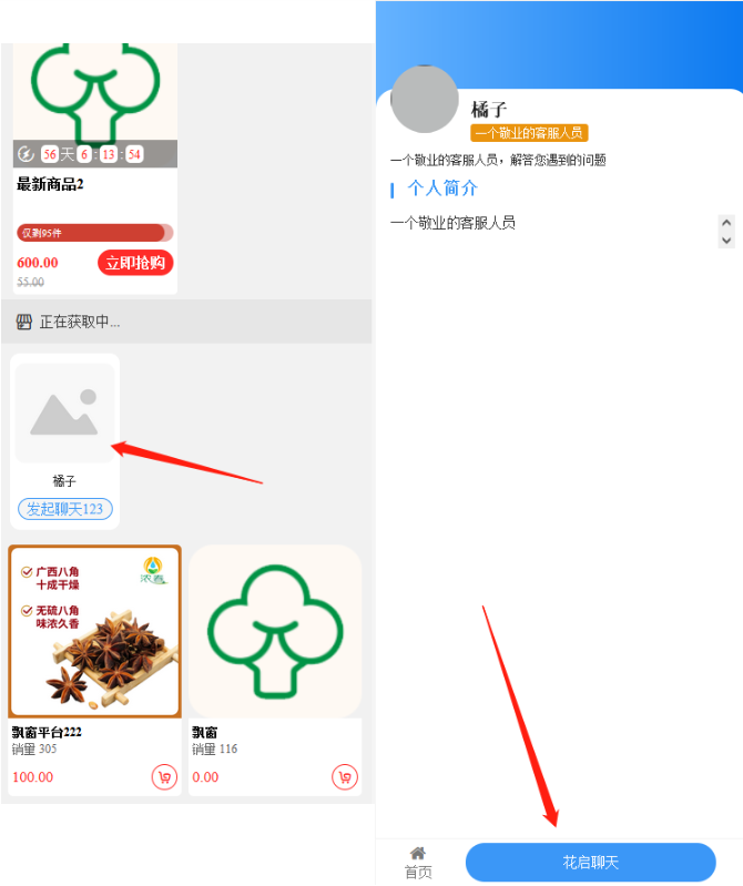 自定义文案:发起聊天可以自定义文字,在装修DIY--放置在线客服组件,在页面可点击查看客服人员详情介绍,下方可以发起聊天