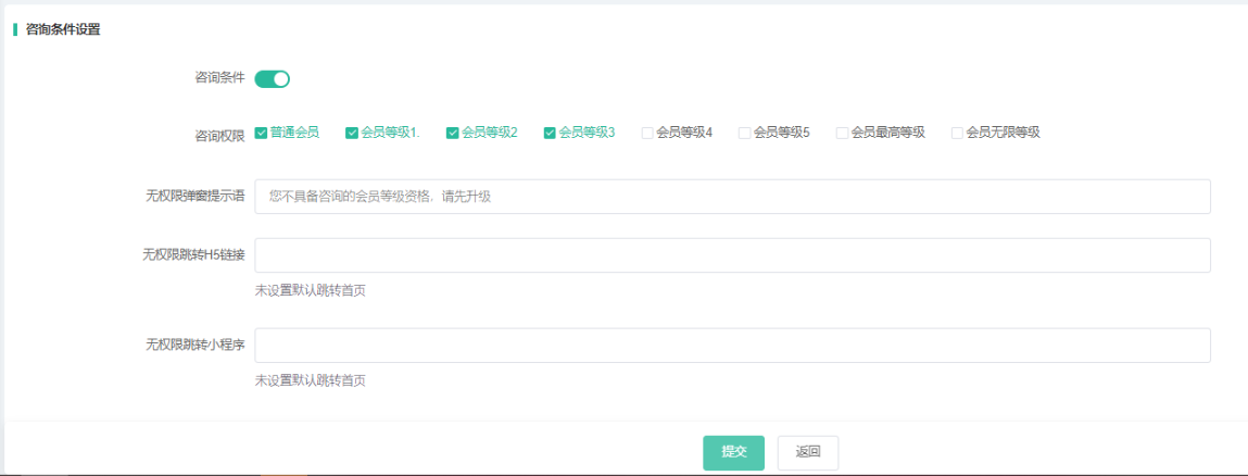 开启咨询条件,只有勾选的会员等级才有权限咨询,不满足等级的会提示您不具备咨询资格,请先升级